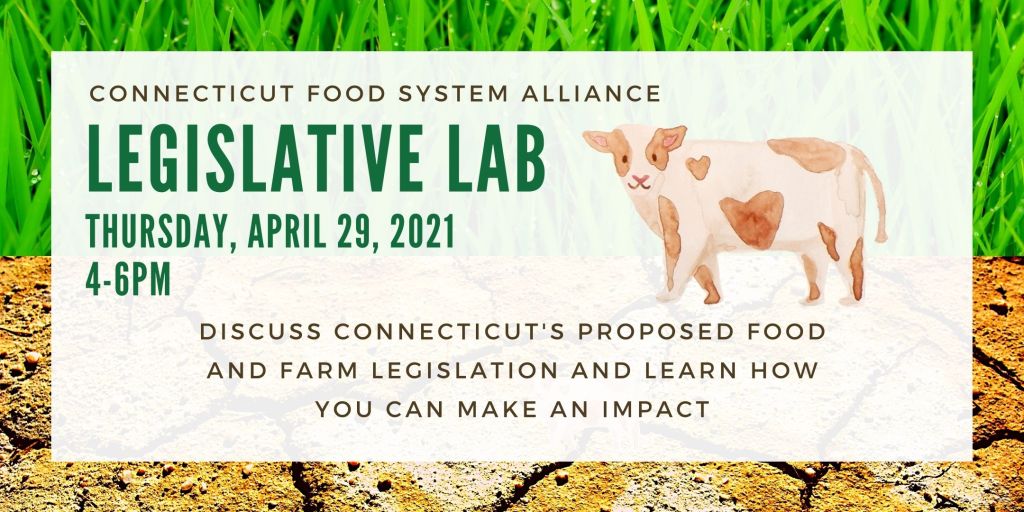 Connecticut’s legislative session is in full swing, but how can Connecticut Food System Allies feel heard? Join CFSA and guest speakers on Thursday, April 29 from 4-6pm for a virtual event to discuss 4 bills in the general assembly pertaining to food and agriculture in Connecticut, and learn from each other about ways to get involved in the legislative process. This Legislative Lab will offer participants the opportunity to learn about Connecticut’s legislative process, talk to advocates and representatives involved in the food system, and workshop ideas to make public testimony and contacting legislators something everyone can achieve.